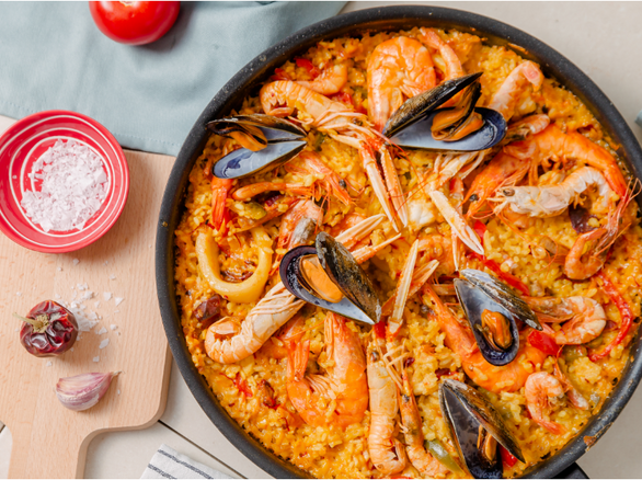 Seafood Paella: Order our exclusive Four Star Paella Kit for the best experience. In this kit, we'll curate all of the ingredients for you! You can also shop ingredients a la carte here. Cook the rice in chicken broth with saffron and garlic. Add shrimp, clams, mussels, and diced chorizo sausage to the rice mixture and simmer until the seafood is cooked through. Serve with a side of crusty bread. Visit our blog post here for our full Four Star Paella Recipe to make at home.