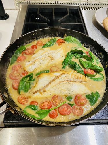 This Braised Petrale Sole in Green Coconut Curry Sauce draws inspiration from a recipe shared by our customer, Monica L. The dish artfully combines our tender, wild-caught local Petrale Sole fillets with a savory green coconut curry sauce, fresh spinach, and cherry tomatoes.