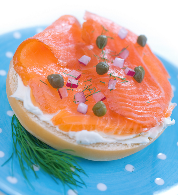 - Place the top halves of the bagels onto the salmon and avocado layers to close the sandwiches.