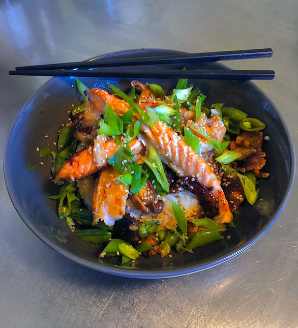 This salmon belly recipe has become one of our favorite summertime dinners. Here the delicious bellies are pan seared and served on a bed of jasmine rice, with spring peas, shiitake mushrooms and fresh green onion.