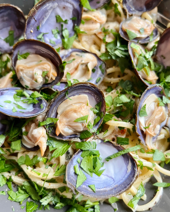 A Simple, Summer Shellfish Pasta for Home Chefs: Savory Blue Clams & Mancini Linguine