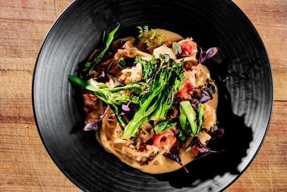 Tankless Lobster Spaghetti with Chanterelle Mushrooms, Bok Choy Rabe from Heirloom Organics Farm.
